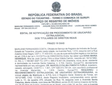 20 de fevereiro de 2026 - 11:35EDITAL DE NOTIFICAÇÃO EM PROCEDIMENTO DE USUCAPIÃO EXTRAJUDICIAL DOS TITULARES DE DIREITOS REAIS