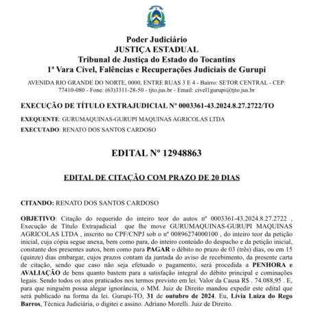 OBJETIVO: Citação do requerido do inteiro teor do autos nº 0003361-43.2024.8.27.2722 , Execução de Título…