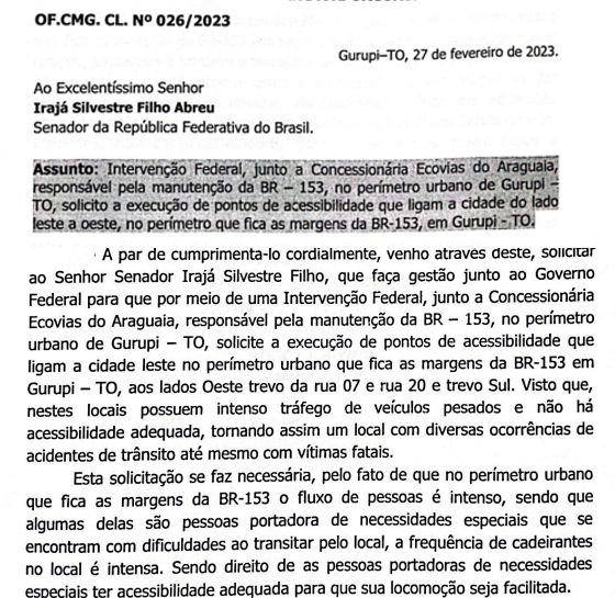 No oficio entregue ao senador, foi pedido medidas para dar mais conforto e segurança aos gurupienses que necessitam cruzar a BR-153 com intervenções como viadutos, passarelas de pedestres e restauração da pavimentação asfáltica no trecho urbano.
