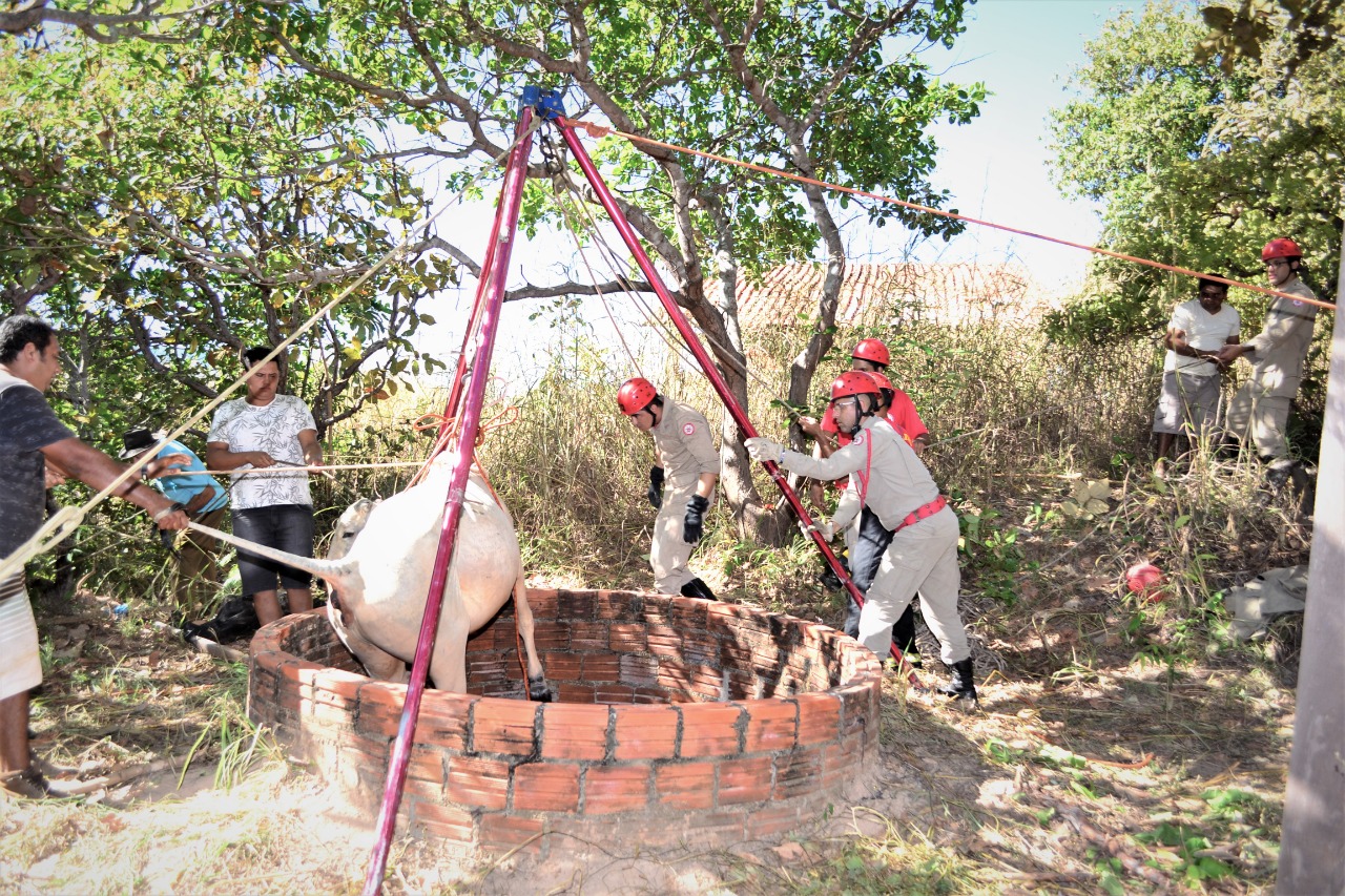 Como o poço estava com água, a vaca não teve ferimentos na hora da queda. O primeiro procedimento dos bombeiros foi usar uma corda amarrada ao pescoço do bicho, e assim evitar a morte por afogamento. A retirada foi feita com uso de um tripé.