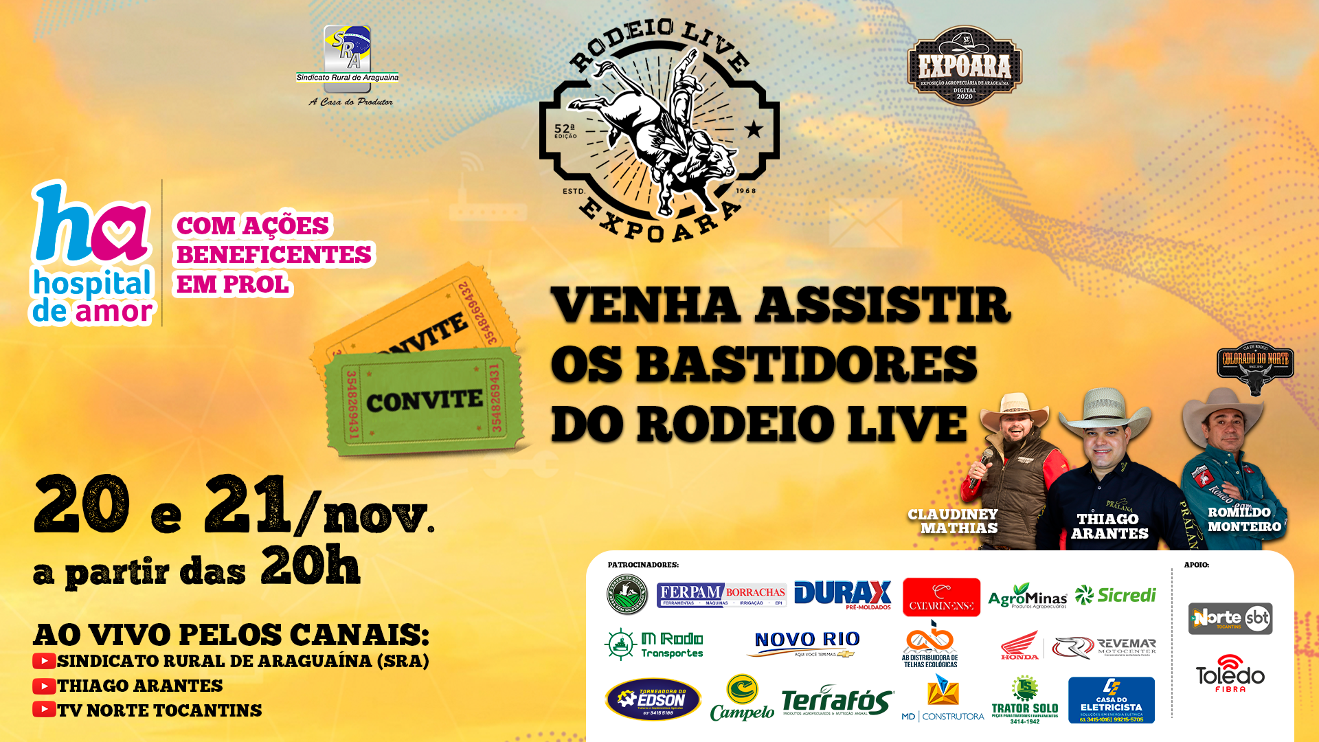 O Rodeio Live faz parte da Expoara Digital 2020 que será realizado na arena do Parque Dair José Lourenço, nos dias 20 e 21 de novembro, a partir das 20h, presencialmente ou nos canais do Sindicato Rural de Araguaína, Tv Norte Tocantins e do comentarista de rodeio Thiago Arantes. Além de assistir as montarias, o público poderá exercer a solidariedade realizando doações em prol do Hospital de Amor do Tocantins, que serão revestidas para a construção da primeira unidade no estado e de um Centro de Diagnóstico em Araguaína.