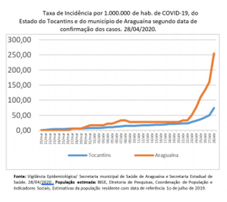 Na figura, pode ser observada a curva da taxa de incidência acumulada por 1 milhão de habitantes da COVID-19, no Estado do Tocantins e em Araguaína. No Estado houve a confirmação do primeiro caso em