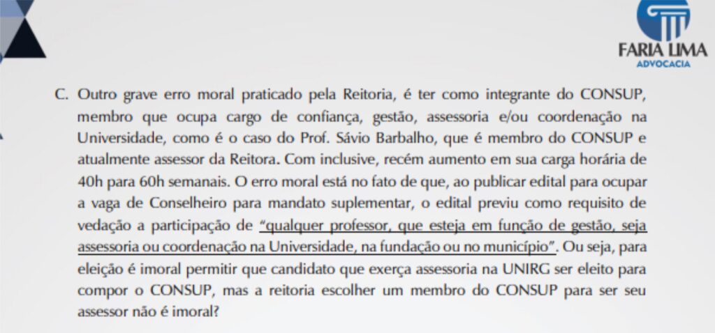A denúncia considera como grave erro moral praticado a Reitoria seria ter o Prof. Sávio Barbalho como membro do CONSUP e atualmente assessor da Reitora.