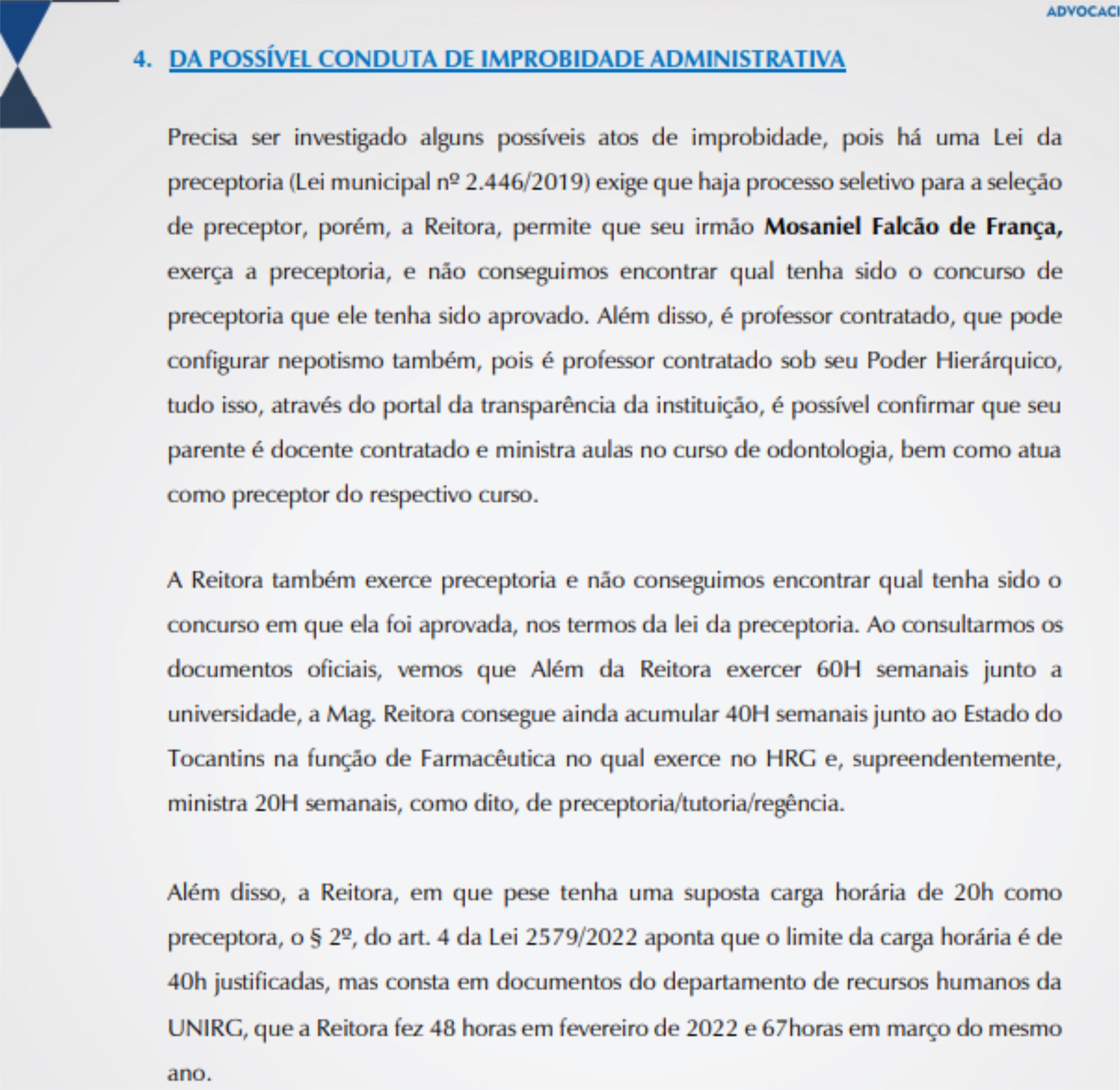 O escritório de advogacia dos revalidandos cita ainda comportamento da Procuradora de Justiça “Leila” no volume de ações e que ela teria recebido “um pedido de socorro de alguém da Unirg”. Isso deve ser investigado! Quem foi essa pessoa da UNIRG que ligou”, pontua a denúncia apresentada na Câmara de Vereadores pelo jurídico dos revalidandos.
