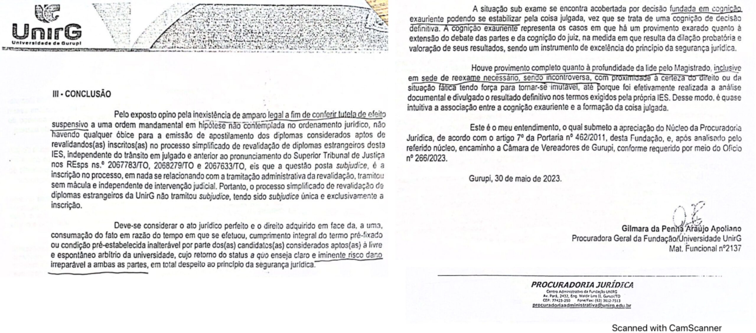 No Perecer, a Procuradoria (leia aqui) apresentou diversas fundamentações jurídicas e na sua conclusão opinou “pela inexistência de amparo legal a fim de conferir tutela de efeito suspensivo a uma ordem mandamental em hipótese não contemplada no ordenamento jurídico, não havendo qualquer óbice para a emissão de apostilamento dos diplomas considerados aptos de revalidandos (as) inscritos (as) no processo simplificado de revalidação de diplomas estrangeiros” da Unirg.