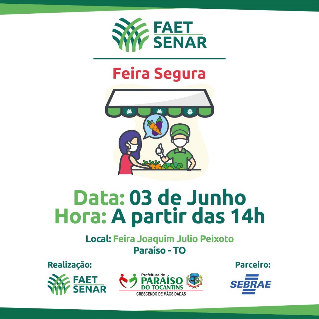 Mais uma edição do projeto Feira Segura será realizada nesta quarta-feira, 3. Desta vez, a feira acontecerá no município de Paraíso, a partir das 14 horas, na Feira Joaquim Júlio Peixoto. O objetivo do projeto é viabilizar o escoamento da produção agropecuária para garantir o abastecimento de alimentos à população, atendendo as normas de segurança e higiene. Com apoio do Sebrae Tocantins, a iniciativa é realizada pelo Serviço Nacional de Aprendizagem Rural (SENAR/TO) e a Confederação Nacional da Agricultura (CNA).