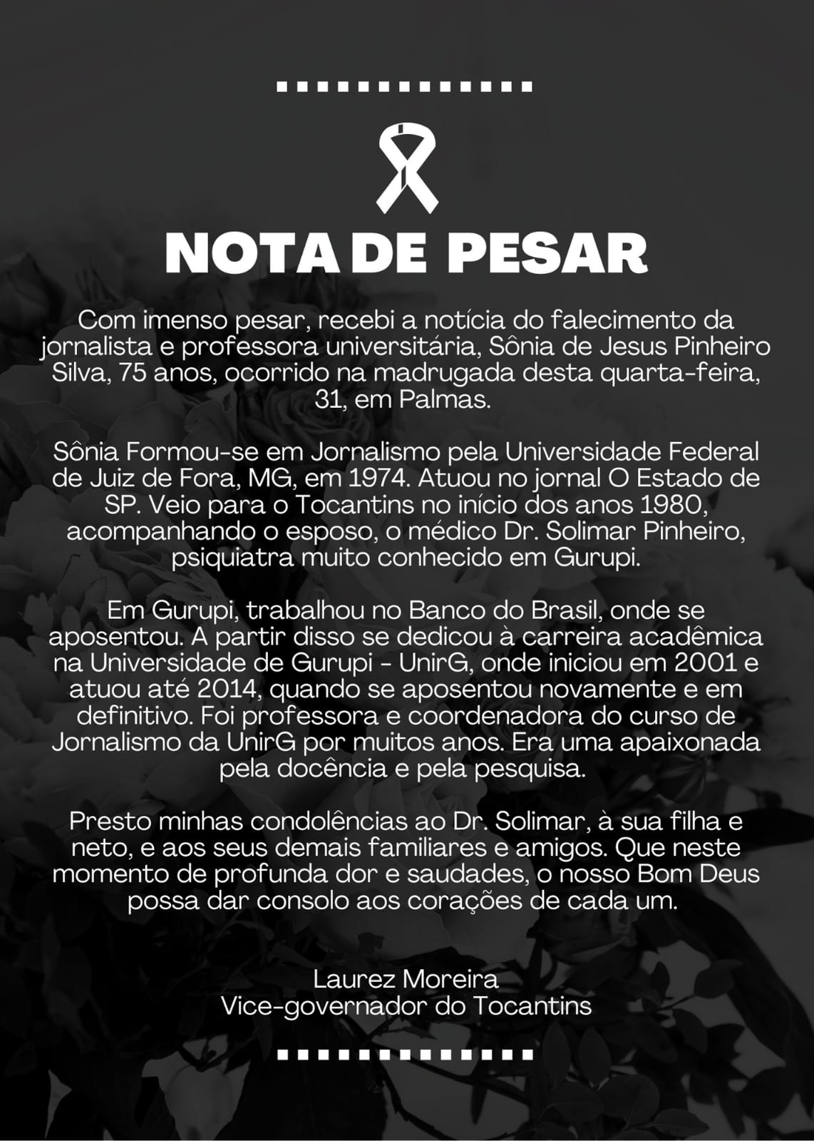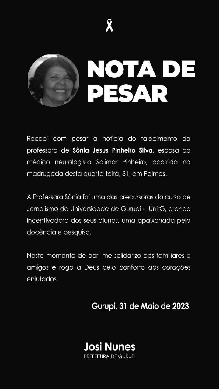 “A professora Sônia foi uma das precursoras do curso de jornalismo da Universidade de Gurupi (UnirG), grande incentivadora dos seus alunos, uma apaixonada pela docência e pesquisa. Neste momento de dor, me solidarizo aos familiares e amigos e rogo a Deus pelo conforto aos corações enlutados”, Josi Nunes.