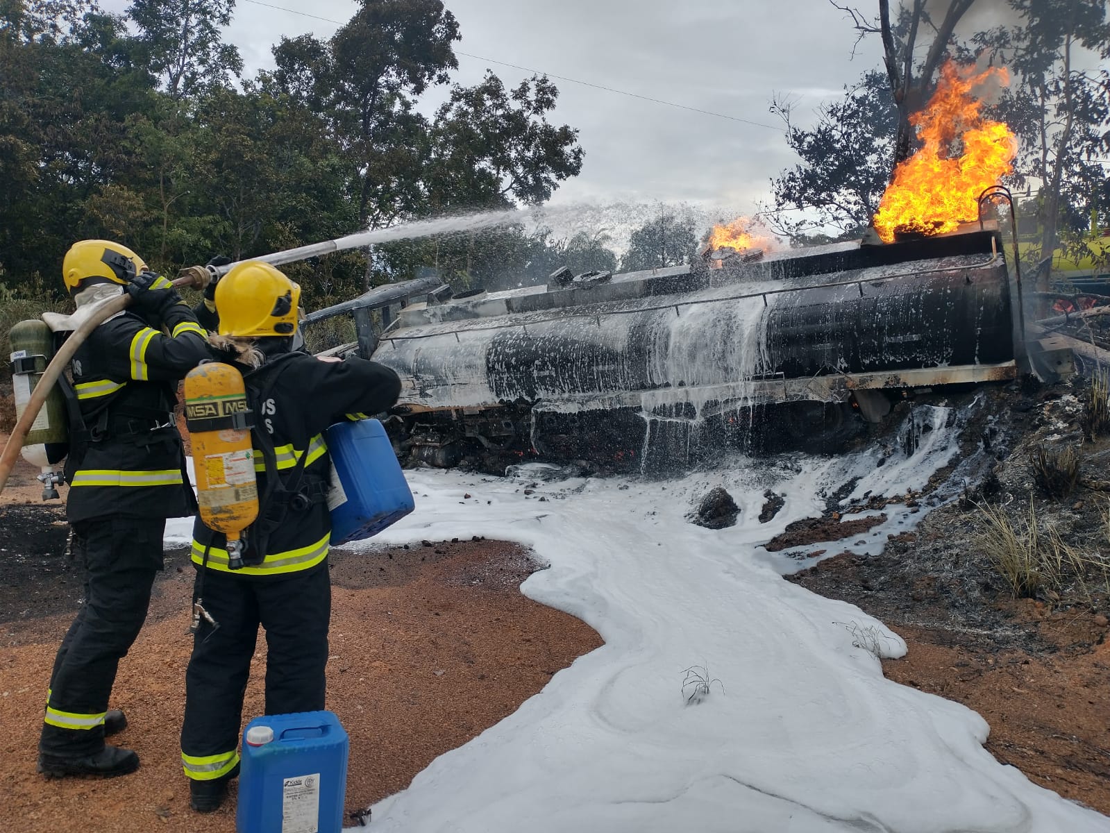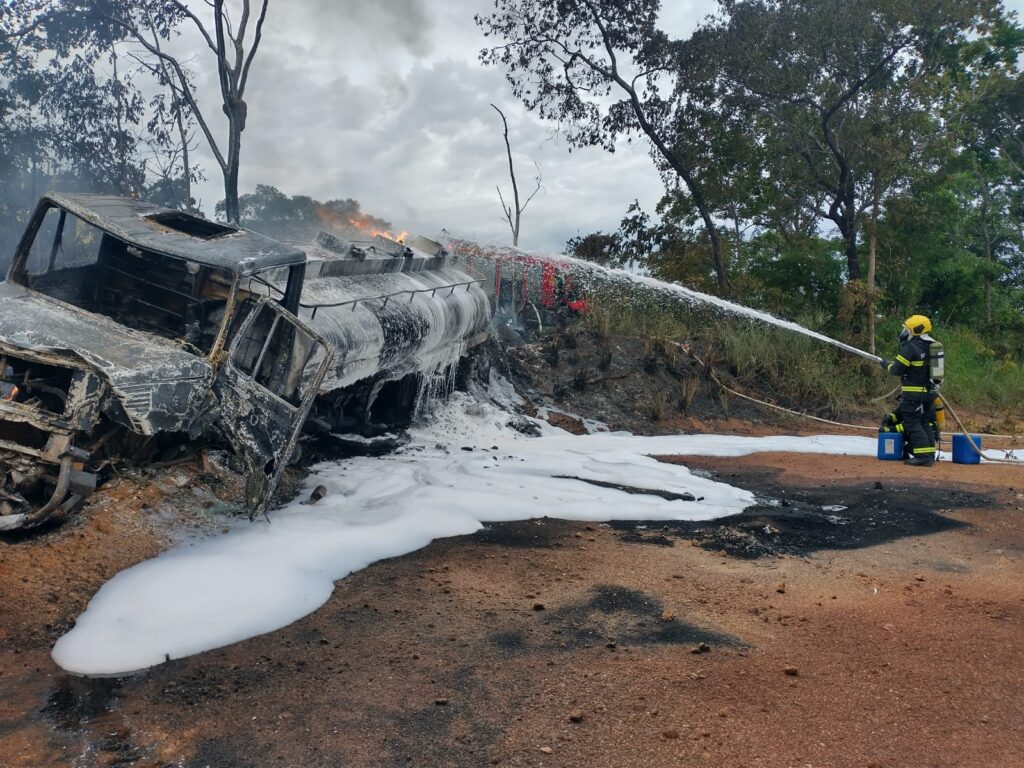 “No local nos deparamos com um caminhão tanque que transportava combustível (etanol e gasolina), em chamas, fora da pista, as margens da rodovia 153. O veículo já havia sido totalmente consumido pelo fogo e a carga no tanque ainda queimava. Com o uso de uma linha de mangueira de pronto emprego, iniciamos o combate ao incêndio utilizando galões liquido gerador de espuma para resfriar e abafar o tanque”, informou o Corpo de Bombeiros.