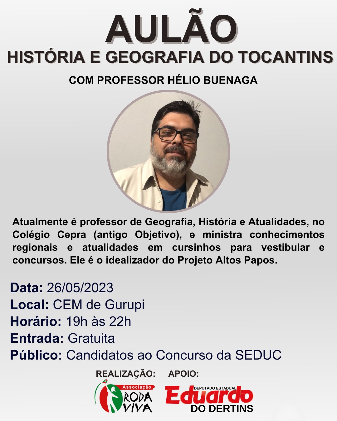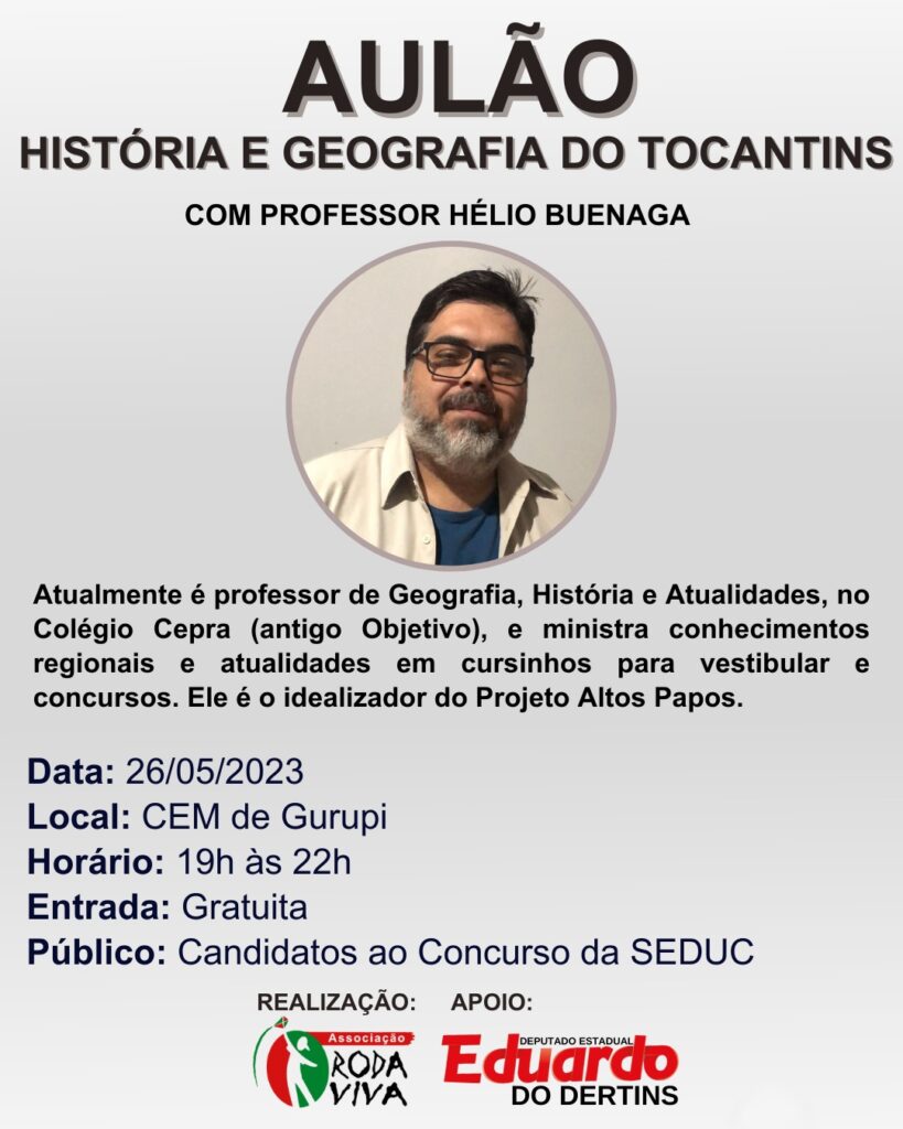 O evento acontece no dia 26 de maio e a aula será ministrada pelo professor Hélio Buenaga, que atualmente é professor de Geografia, História e Atualidades, no CEPA (antigo Colégio Objetivo,) e ministra Conhecimentos regionais e atualidades em cursinhos para vestibular e concursos.