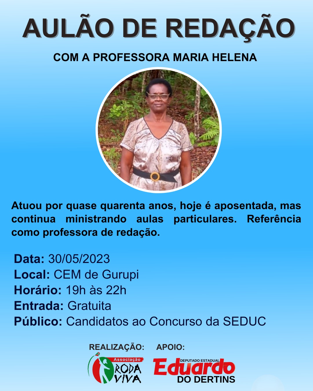 Já no dia 30 de maio terá uma aula de redação ministrada pela professora Maria Helena, que atuou por quase quarenta anos e hoje é aposentada, mas continua ministrando aulas particulares.