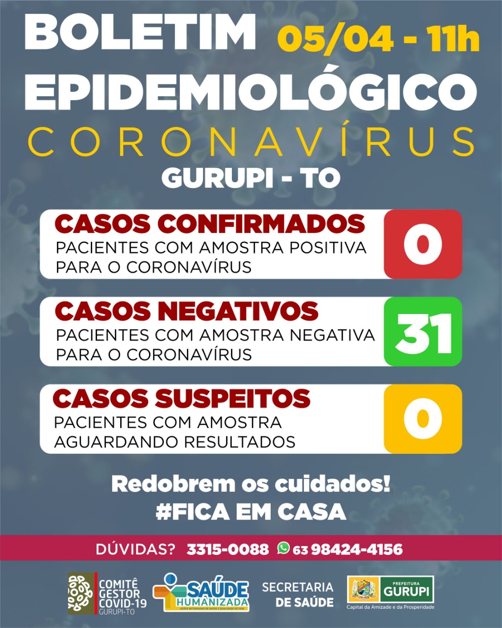 Quaisquer dúvidas podem ser esclarecidas por meio da ouvidoria do município pelos números: (63) 3315-0077 e 0800 646 3366; também pela Vigilância Epidemiológica: (63) 98424-4156 ou 3315-0088; e pelo e-mail: [email protected]; além das redes sociais e contatos institucionais que podem ser encontrados no site da Prefeitura de Gurupi.