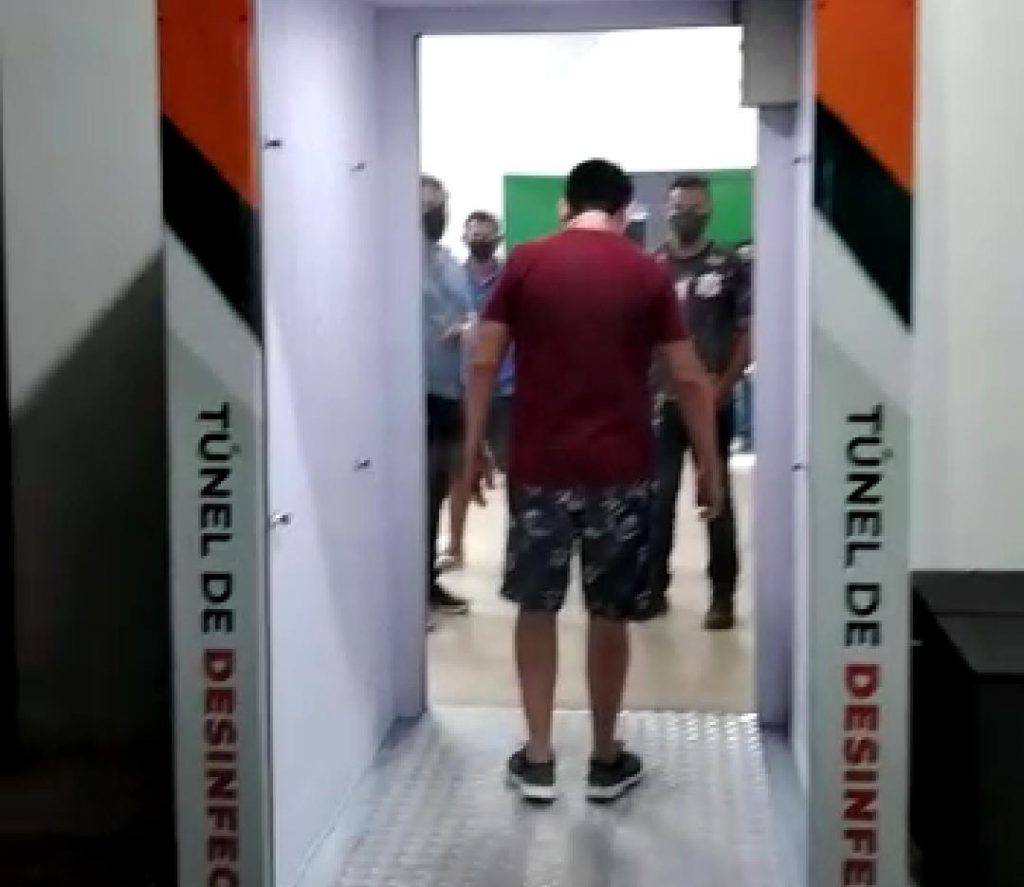 O dispositivo é equipado com pulverizadores que liberam hipoclorito, substância desinfetante e que ajuda a combater não só o novo Coronavírus, mas também outros tipos de vírus.