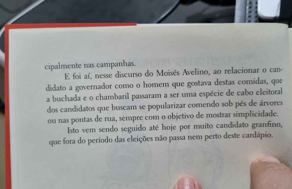 O livro “Na ponta da Língua – Causos ‘coisados’’ também desvenda algumas simbologias ainda vivas na política do Tocantins que se repetiu nas últimas eleições municipais, criadas como estratégias para atrair o eleitor, como a mostrada no conto, Cabos Eleitorais: Buchada e Chabari, com narrativas da eleição de 1994, no discurso de Moisés Avelino em defesa da candidatura de João Cruz ao governo do Tocantins, como homem simples e do povo.