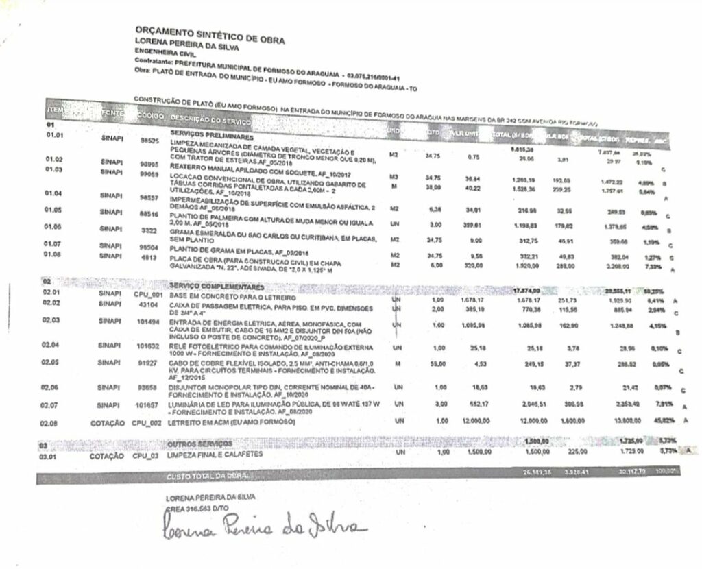 Na descrição do termo do memorial descritivo da licitação encomendado pela Prefeitura Municipal de Formoso à engenheira Lorena Pereira da Silva a construção de um platô (letreiro) na entrada da cidade com a frase “Eu amo Formoso”, deveria custa R$ 30.117,79. O memorial descritivo da licitação atende o art. 6º, III, Lei nº 8.666/93 com especificação do projeto e aquisição remunerada de bens para fornecimento da obra.