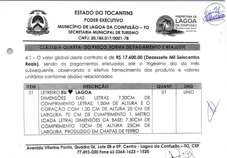 O Portal Atitude teve acesso a um contrato (veja)  com uma obra do mesmo porte no município de Lagoa da Confusão. O custo da obra feita por outra empresa foi de 17.600,00, conforme mostra a parte da cláusula quarta do contrato – do preço.