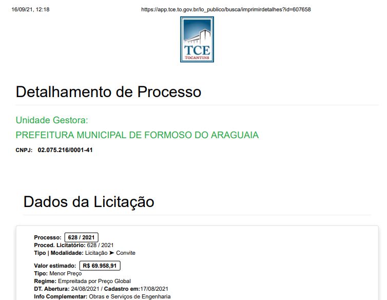 Conforme o Sistema Integrado de Auditoria Pública (SICAP), do Tribunal de Contas do Estado do Tocantins, a licitação da obra encontra-se na última fase, porém a prefeitura já implantou a placa da obra no valor de R$ 69.958,91, ou seja a Prefeitura de Formoso do Araguaia administrada pelo prefeito Heno Rodrigues (PTB), considerado o gestor mais jovem do estado, colocou a placa da empresa contratada antes mesmo de ter a definição da licitação.