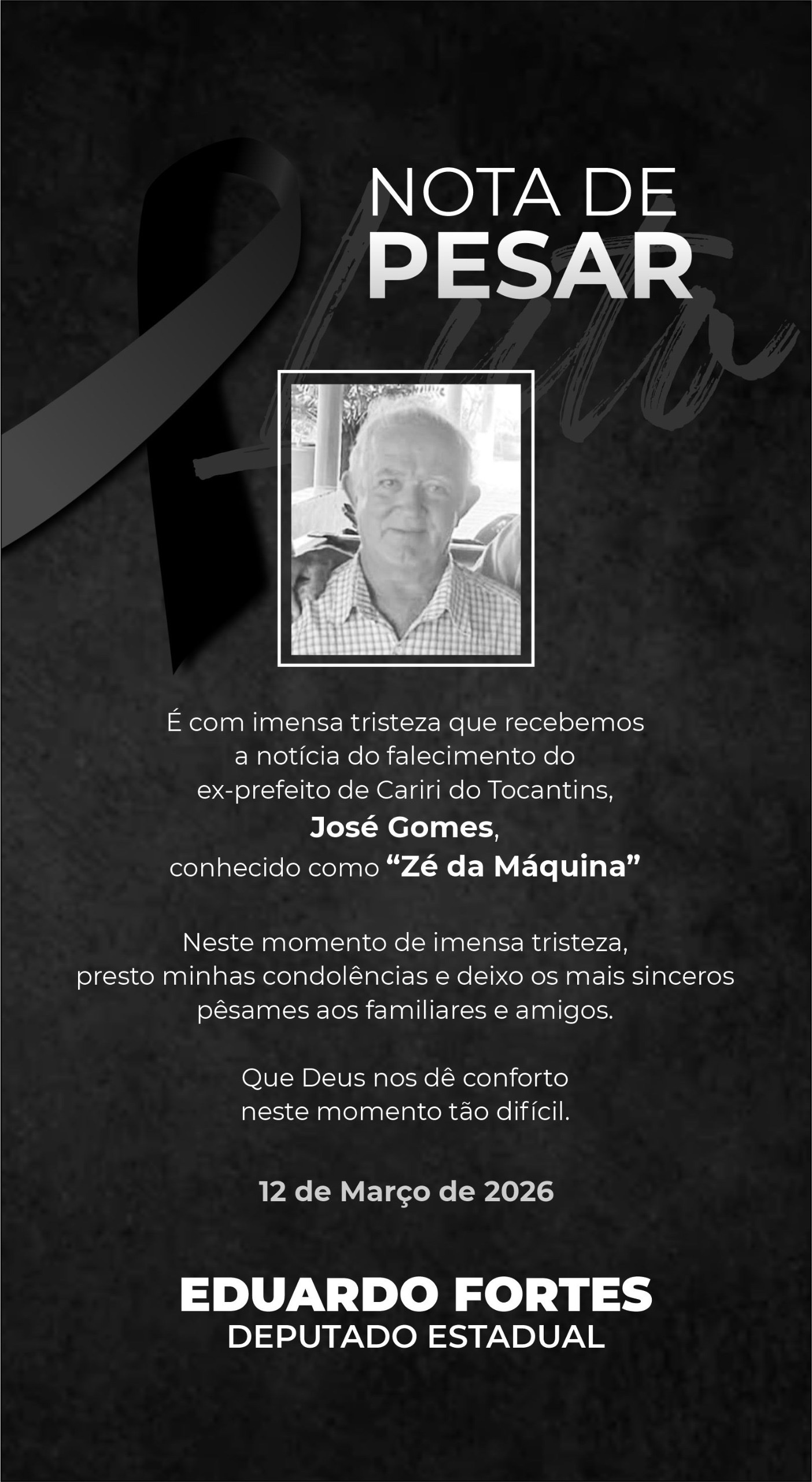 A Prefeitura de Cariri do Tocantins decretou luto oficial de três dias, nesta quinta-feira, 12 de março, em razão do falecimento do ex-prefeito e ex-vereador José Gomes, conhecido pela comunidade como “Zé da Máquina”. O deputado Eduardo Fortes também lamentou a morte do ex-prefeito em nota de Pesar