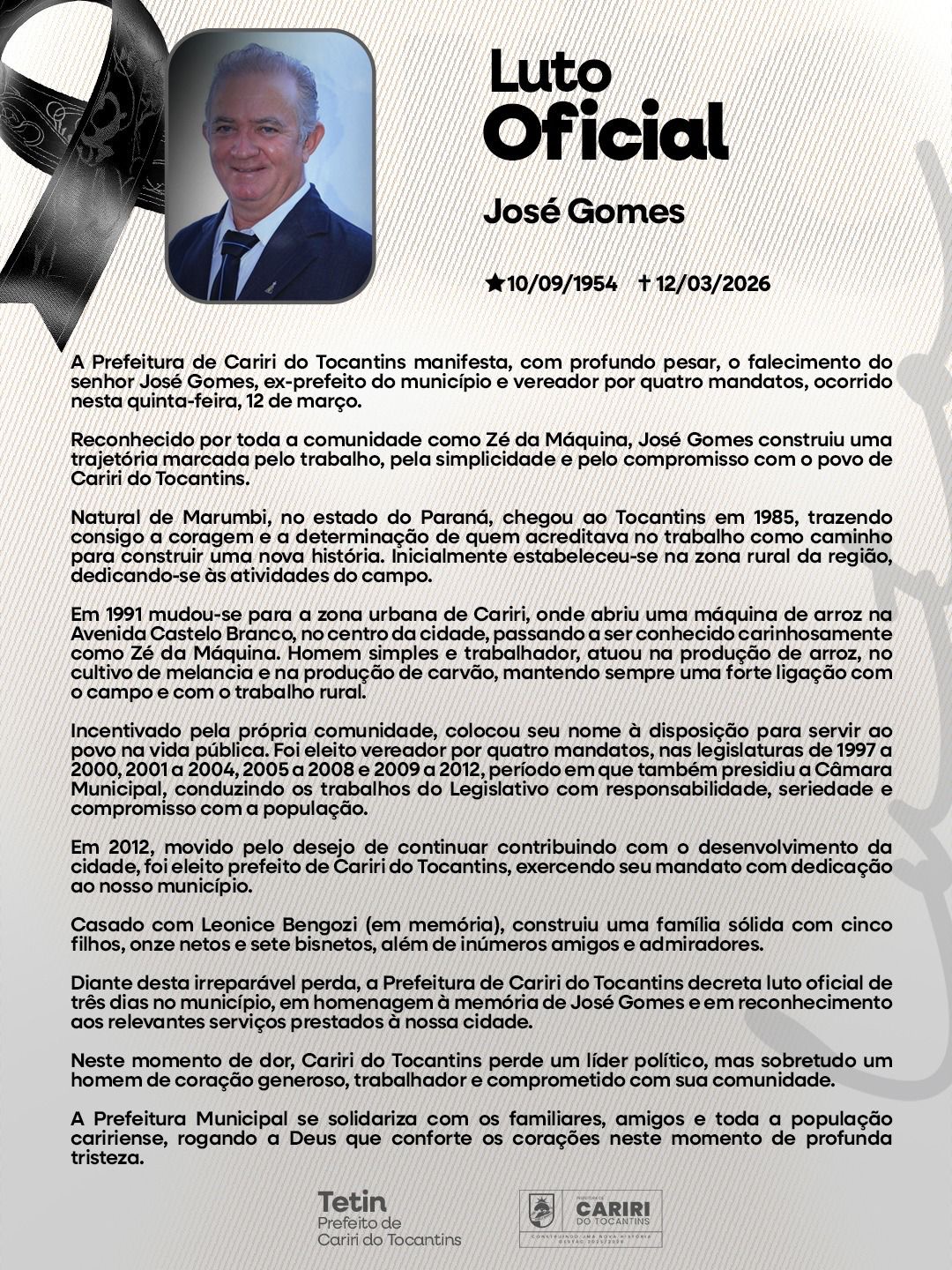 Ao decretar o luto oficial, a gestão municipal destaca a trajetória de trabalho, simplicidade e compromisso de José Gomes com a comunidade de Cariri do Tocantins e reconhece os serviços prestados ao município.