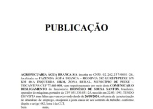 AGROPECUÁRIA ÁGUA BRANCA S/A inscrita no CNPJ: 02.262.557/0001-26, localizada na FAZENDA ÁGUA BRANCA – RODOVIA 242 GURUPI/PEIXE S/N KM 40-A…