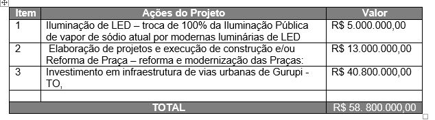 O pedido autoriza o município contratar financiamento do BB no valor do R$ 58.800.000,00 e, beneficiará, além das obras de pavimentação e recuperação da malha asfáltica com material em CBUQ no valor de R$ 40.800.000,00, prevê investimentos no valor de R$ 5 milhões em Iluminação de LED – troca de 100% da Iluminação Pública de vapor de sódio atual por modernas luminárias de LED; R$ 13 milhões para elaboração de projetos e execução de construção e/ou Reforma de Praça – reforma e modernização das Praças.