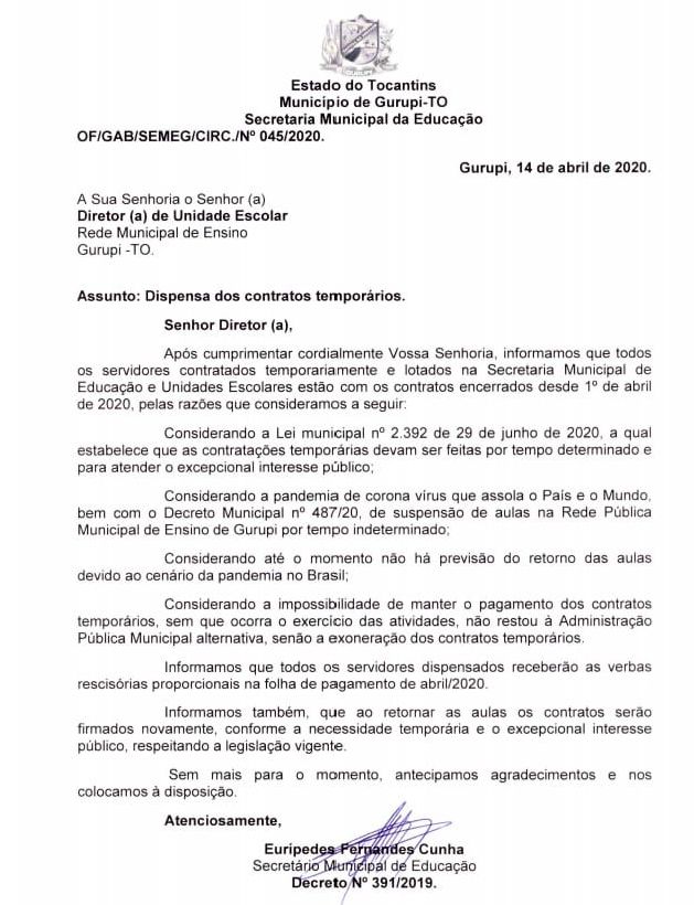 O secretário municipal de Educação de Gurupi, Eurípedes Fenandes Cunha enviou um ofício às diretoras e diretores das unidades escolares da rede municipal de ensino de Gurupi comunicando a dispensa dos contratos temporários.