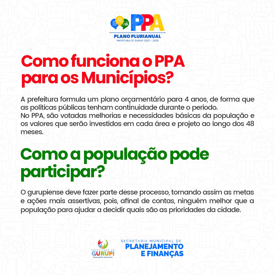 Ainda de acordo com o secretário, são sete questões de múltipla escolha e sete questões abertas para o cidadão emitir sua opinião sobre cada área. “É muito importante a participação de toda a comunidade. A construção do PPA é a materialização de uma Lei sobre o que a gestão vai executar nos próximos 4 anos. Lembrando que a elaboração do PPA seguiu todo um norte administrativo. Aquilo que foi levado às ruas pela prefeita Josi Nunes e pelo vice Gleydson Nato, e que agora será a concretização do que a administração irá realizar em cada área”, completou Lucas.
