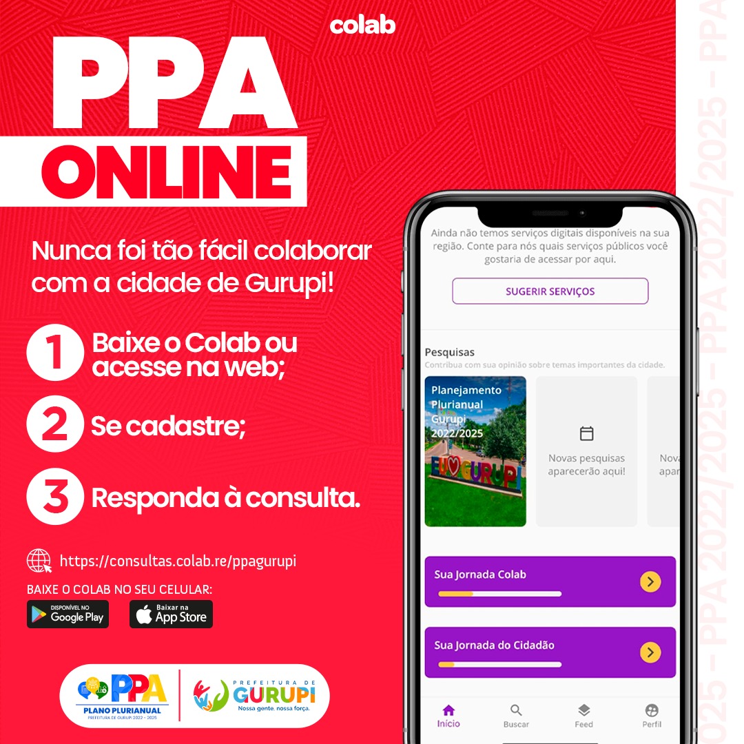 Segundo o secretário municipal de Planejamento e Finanças, Lucas Lemes, a consulta pública já está disponível no aplicativo, e para opinar, é simples. “Basta baixar o aplicativo Colab, fazer o cadastro, ir na aba pesquisas, clicar e responder às perguntas sobre os 7 eixos temáticos que são inerentes ao PPA, lá o cidadão vai poder responder sobre saúde, infraestrutura, educação, cultura, mobilidade urbana, esporte, lazer e muito mais”, explicou.