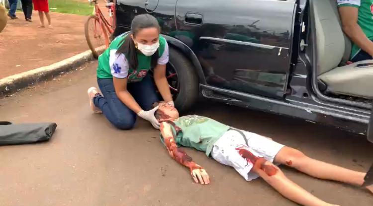 Na aula prática foi utilizada uma motocicleta na simulação de acidente de trânsito, tendo as vítimas fratura raque-medular, resultante da queda de moto. No decorrer do curso, também houve simulações de ferimentos com arma branca, esfacelamento, visceração, traumas de membros superiores, além de crânio-encefálico.