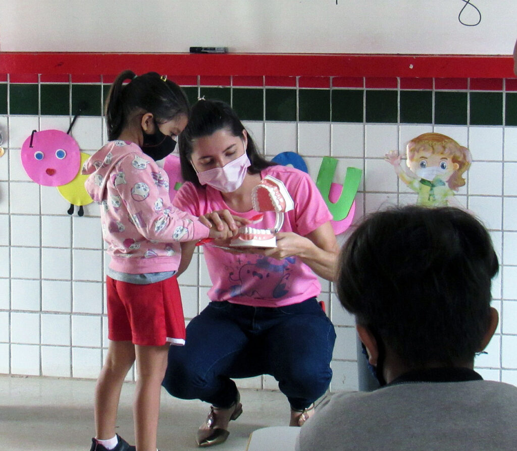 As orientações de higiene bucal foram ministradas por profissionais da área de odontologia, e os kits foram individualmente distribuídos por servidores da saúde municipal, acompanhados da secretária municipal de saúde, Vanessa Vancetto Nazato, juntamente com a secretária municipal de educação, Marília Medeiros.