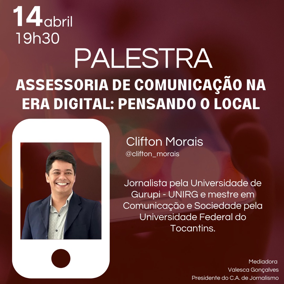 Convidado: Jornalista Clifton Morais e mediação da presidente do Centro Acadêmico de Jornalismo, a acadêmica Valesca