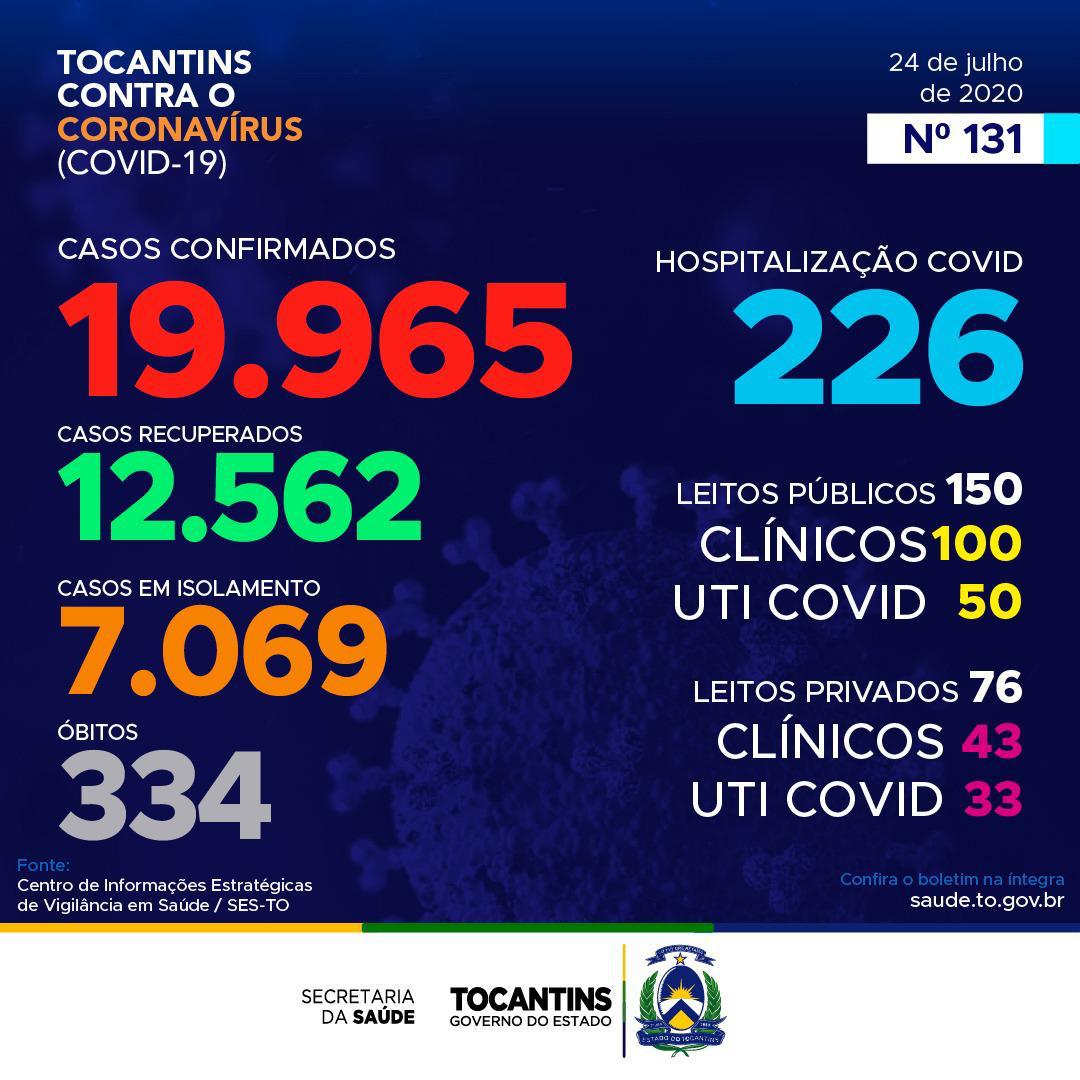Atualmente, o Tocantins apresenta 19.965 casos no total, destes, 12.562 pacientes estão recuperados, 7.069 pacientes estão ainda em isolamento domiciliar ou hospitalar e 334 pacientes foram a óbito.
