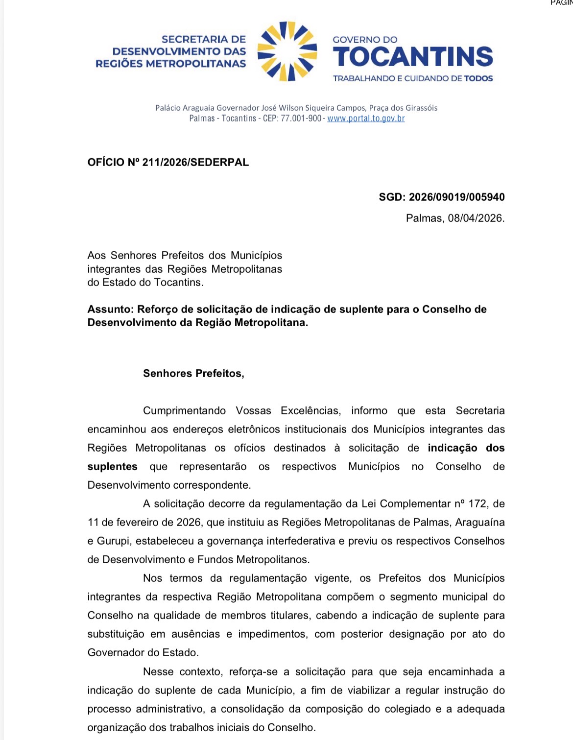 Tendo como referência o DECRETO Nº 7.141, DE 7 DE ABRIL DE 2026, bem como o Oficio 211/2026/SEDERPAL, a coordenadora da Região Metropolitana de Gurupi está evidenciando todos os esforços para que dentro de tempo hábil o Conselho possa ser formalizado pois desse depende o sucesso das ações a serem desenvolvidas pelo estado, no âmbito dos municípios, a considerar os recursos dos Fundos Metropolitanos