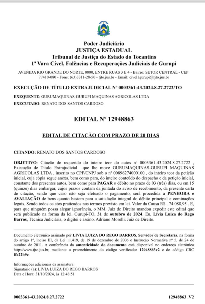 OBJETIVO: Citação do requerido do inteiro teor do autos nº 0003361-43.2024.8.27.2722 , Execução de Título Extrajudicial que lhe move GURUMAQUINAS-GURUPI MAQUINAS AGRICOLAS LTDA , inscrito no CPF/CNPJ sob o nº 00896274000100 , do inteiro teor da petição inicial, cuja cópia segue anexa, bem como para, do inteiro conteúdo do despacho e da petição inicial, constante dos presentes autos, bem como para PAGAR o débito no prazo de 03 (três) dias, ou em 15 (quinze) dias embargar, cujos prazos contam da juntada do aviso de recebimento, da presente carta de citação, sendo que caso não seja efetuado o pagamento, será procedida a PENHORA e A V ALIAÇÃO de bens quanto bastem para a satisfação integral do débito principal e cominações legais. Sendo todos os atos praticados nos termos previsto em lei. Valor da Causa R$ . 74.088,95…