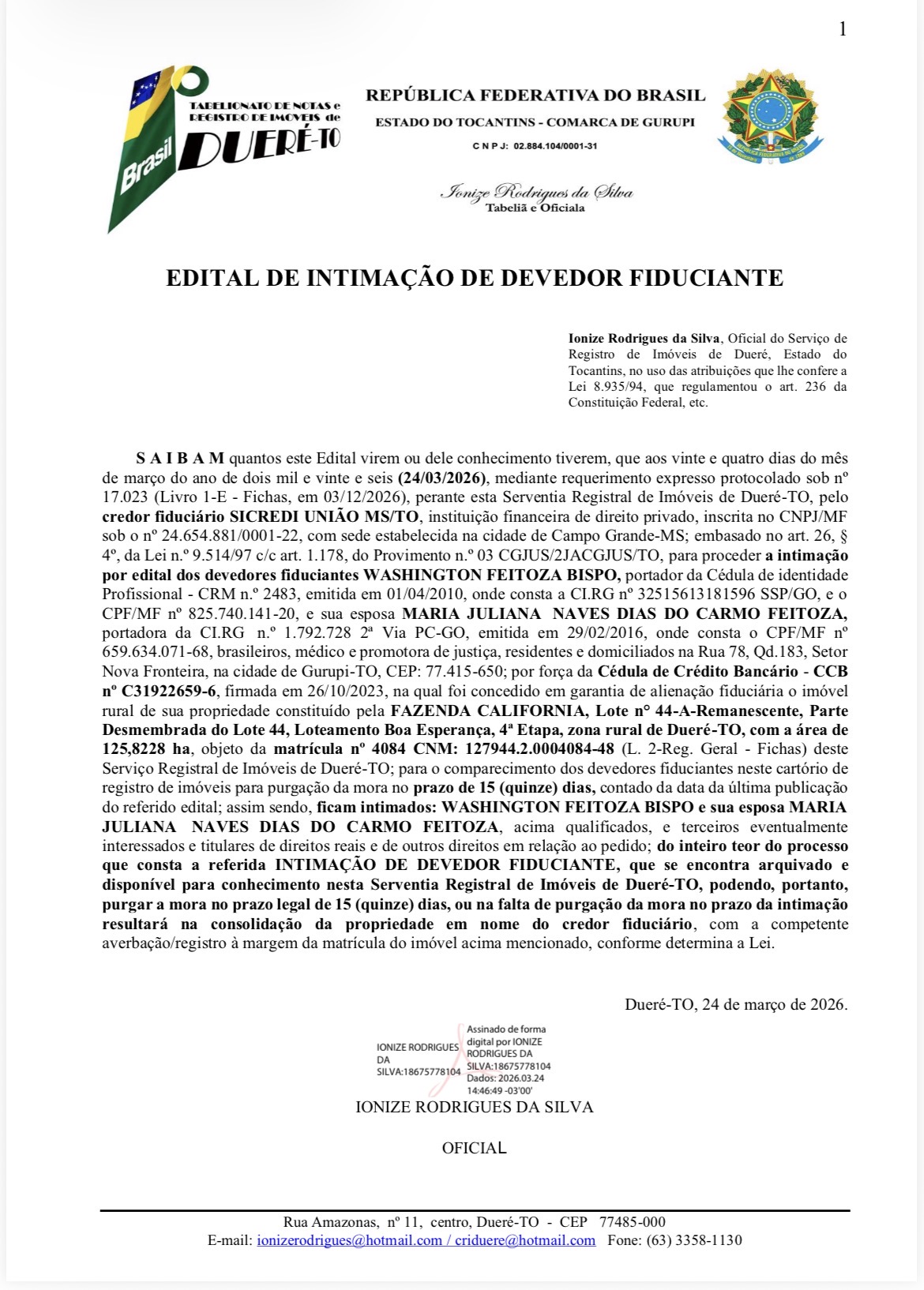 S A I B A M quantos este Edital virem ou dele conhecimento tiverem, que aos vinte e quatro dias do mês de março do ano de dois mil e vinte e seis (24/03/2026), mediante requerimento expresso protocolado sob nº 17.023 (Livro 1-E – Fichas, em 03/12/2026), perante esta Serventia Registral de Imóveis de Dueré-TO, pelo credor fiduciário SICREDI UNIÃO MS/TO, instituição financeira de direito privado, inscrita no CNPJ/MF sob o nº 24.654.881/0001-22, com sede estabelecida na cidade de Campo Grande-MS; embasado no art. 26, § 4º, da Lei n.º 9.514/97 c/c art. 1.178, do Provimento n.º 03 CGJUS/2JACGJUS/TO, para proceder a intimação por edital dos devedores fiduciantes WASHINGTON FEITOZA BISPO, portador da Cédula de identidade Profissional – CRM n.º 2483, emitida em 01/04/2010, onde consta a CI.RG nº 32515613181596 SSP/GO, e o CPF/MF nº 825.740.141-20, e sua esposa MARIA JULIANA NAVES DIAS DO CARMO FEITOZA, portadora da CI.RG n.º 1.792.728 2ª Via PC-GO, emitida em 29/02/2016, onde consta o CPF/MF nº 659.634.071-68, brasileiros, médico e promotora de justiça, residentes e domiciliados na Rua 78, Qd.183, Setor Nova Fronteira, na cidade de Gurupi-TO, CEP: 77.415-650…