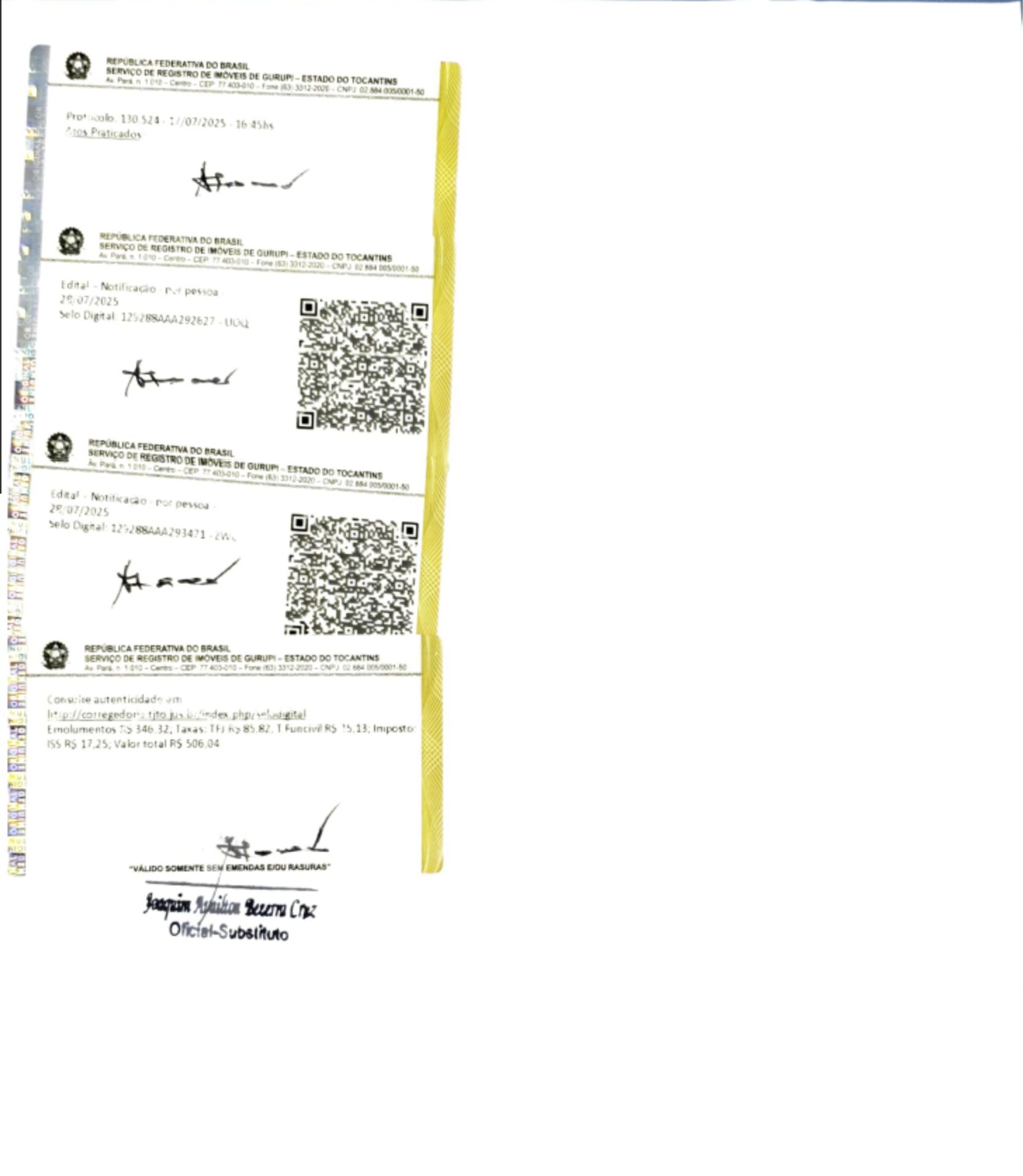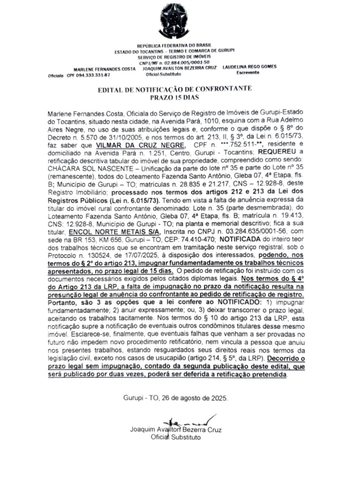 Marlene Fernandes Costa, Oficiala do Serviço de Registro de Imóveis de Gurupi-Estado do Tocantins, situado nesta cidade, na Avenida Pará, 1010, esquina com a Rua Adeimo Aires Negre, no uso de suas atribuições legais e, conforme o que dispõe o § 8° do Decreton. 5.570 de 31/10/2005., e nos termos do art. 213, II, § 30, da Lei n. 6.015/73, faz saber que VILMAR DA CRUZ NEGRE, CPF n. ***.752.511-**, residente e domiciliado na Avenida Pará n. 1.251, Centro. Gurupi – Tocantins; REQUEREU a retificação descritiva tabular do imóvel de sua propriedade, compreendido como sendo: CHÁCÁRA SOL NASCENTE-Unificação da parte do lote n° 35 e parte do Lote n° 35 (remanescente), todos do Loteamento Fazenda Santo Antônio, Gleba 07, 4° Etapa, fis. B; Municipio de Gurupi – TO; matrículas n. 28.835 e 21.217, CNS – 12.928-8, deste Registro Imobiliário; processado nos termos dos artigos 212 e 213 da Lei dos Registros Públicos (Lei n. 6.015/73). Tendo em vista a falta de anuência expressa da titular do imóvel rural confrontante denominado: Lote n. 35 (parte desmembrada), do Loteamento Fazenda Santo Antônio, Gleba 07, 4a Etapa, fls. B; matrícula n. 19.413, CNS: 12.928-8, Municipio de Gurupi TO; na planta e memorial descritivo; fica a sua titular, ENCOL NORTE METAIS SIA