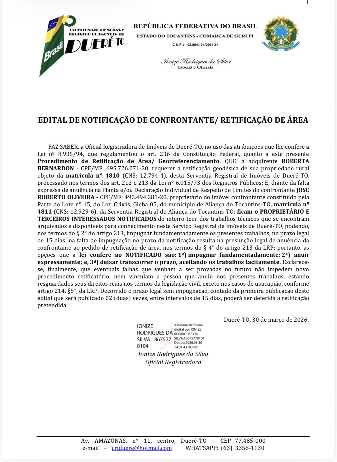 FAZ SABER, a Oficial Registradora de Imóveis de Dueré-TO, no uso das atribuições que lhe confere a Lei nº 8.935/94, que regulamentou o art. 236 da Constituição Federal, quanto a este presente Procedimento de Retificação de Área/ Georreferenciamento, QUE: a adquirente ROBERTA BERNARDON – CPF/MF: 695.726.071-20, requerer a retificação geodésica de sua propriedade ruralobjeto da matrícula nº 4810 (CNS: 12.794-4), desta Serventia Registral de Imóveis de Dueré-TO, processado nos termos dos art. 212 e 213 da Lei nº 6.015/73 dos Registros Públicos; E, diante da falta expressa de anuência na Planta e/ou Declaração Individual de Respeito de Limites do confrontante JOSÉ ROBERTO OLIVEIRA – CPF/MF: 492.494.281-20, proprietário do imóvel confrontante constituído pela Parte do Lote nº 15, do Lot. Crixa s, Gleba 05, do municí pio de Aliança do Tocantins-TO, matrícula nº 4811 (CNS: 12.929-6), da Serventia Registral de Aliança do Tocantins-TO; ficam o PROPRIETÁRIO E TERCEIROS INTERESSADOS NOTIFICADOS do inteiro teor dos trabalhos técnicos que se encontram arquivados e disponíveis para conhecimento neste Serviço Registral de Imóveis de Dueré-TO…