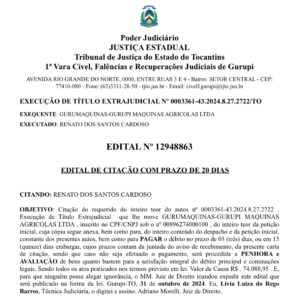 OBJETIVO: Citação do requerido do inteiro teor do autos nº 0003361-43.2024.8.27.2722 , Execução de Título Extrajudicial que lhe move GURUMAQUINAS-GURUPI…