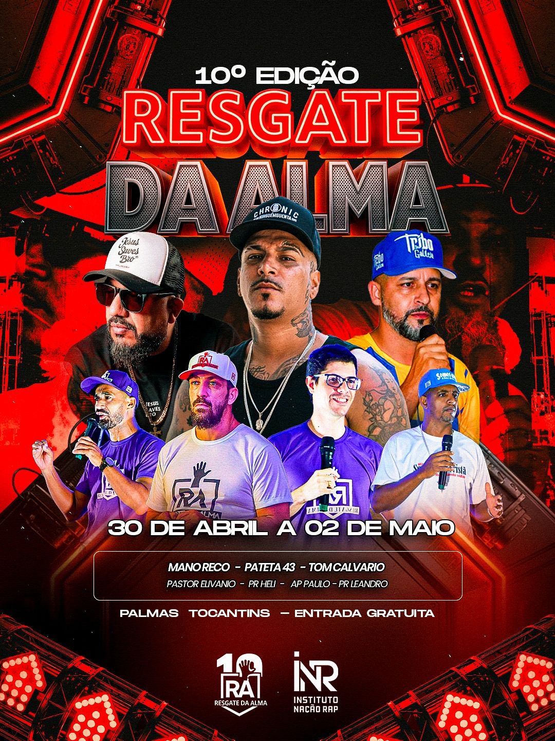 A partir desta quinta-feira (30), tem início em Palmas a 10ª edição do “Resgate da Alma”, evento promovido pelo Instituto Nação Rap que, ao longo dos últimos anos, vem se consolidando como uma importante ação de transformação social e espiritual na capital tocantinense.
