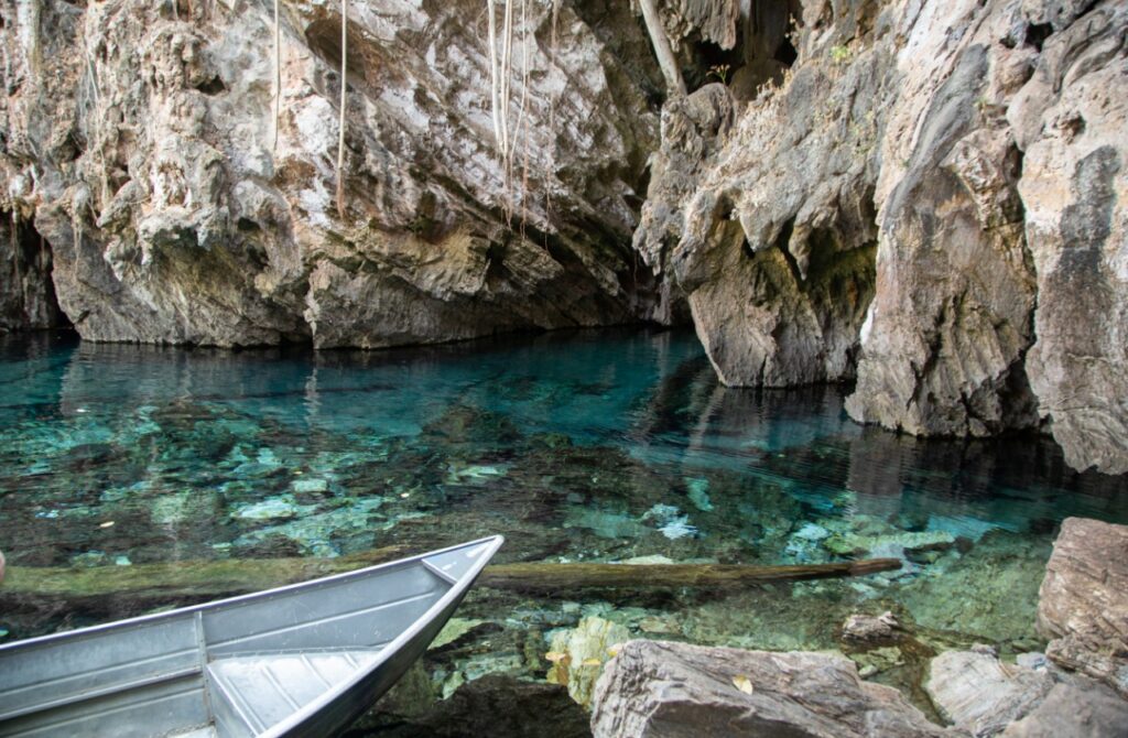 O entorno da caverna exibe uma beleza cênica incrível, formada por uma piscina de águas em tom azul intenso. Os efeitos de luz e sombra em todo o ambiente cercado de formações rochosas primitivas e vegetação típica impressionam.