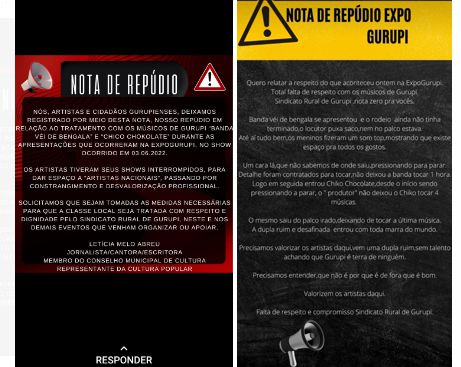 Dois músicos publicaram nas redes sociais Notas de Repúdios episódios envolvendo a contratação de artistas regionais no dia 03 de junho durante a 48ª Expo Gurupi. Em uma delas assinada pela artista Letícia Melo Abreu lamentou um episódio envolvendo a contratação da banda Véi de Bengala e do músico Chico Chokolate que “tiveram seus shows interrompidos para dar espaço a um artista nacional”. Em nota, o Sindicato Rural informou que as contratações dos músicos de renome nacional não tiveram “qualquer vínculo com o Sindicato Rural”.