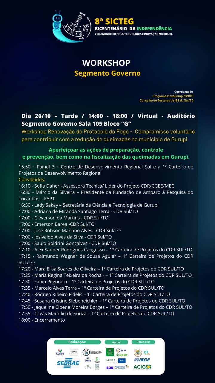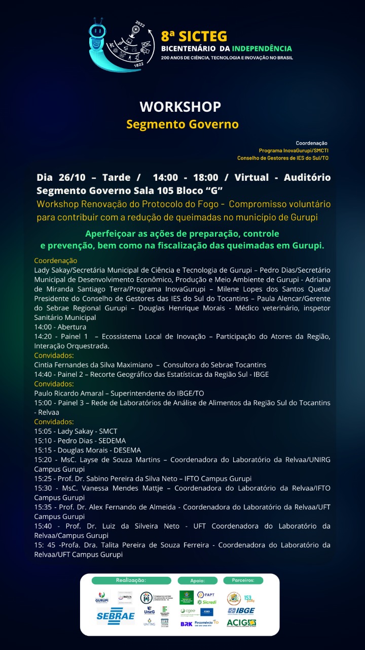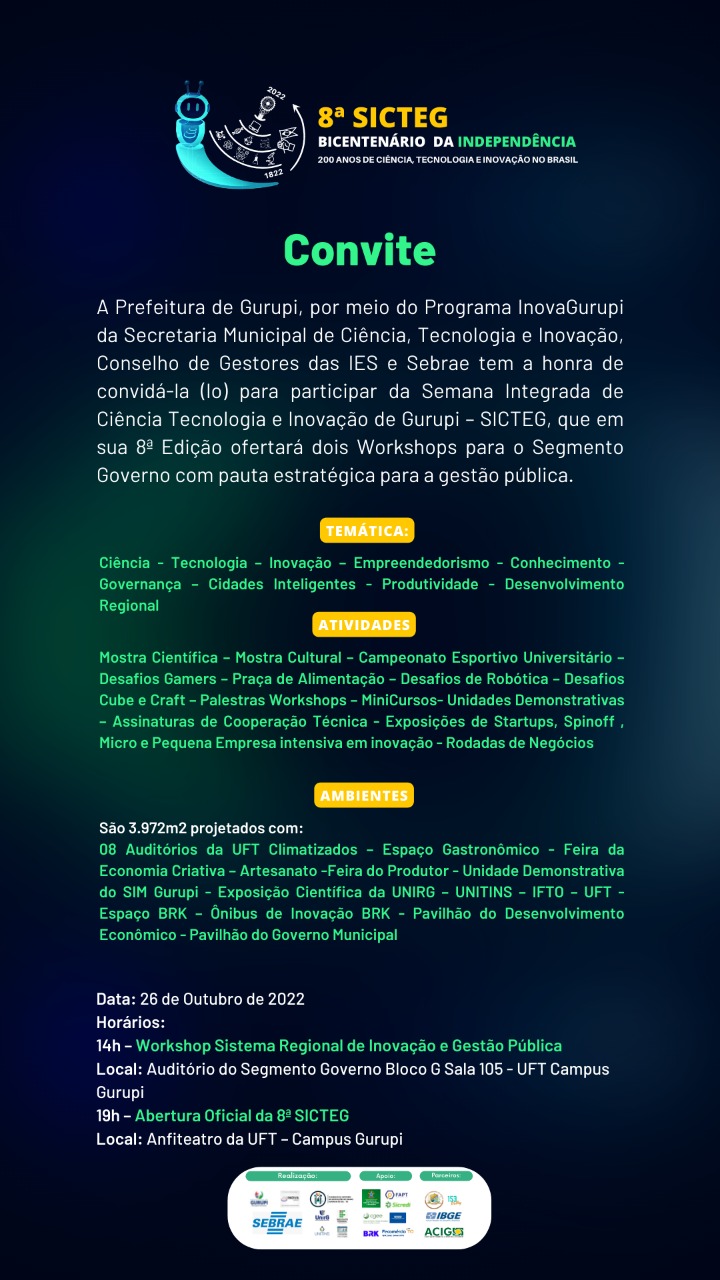 Com o tema “Bicentenário da independência. 200 anos de ciência, tecnologia e inovação no Brasil”, a 8ª edição da Semana Integrada de Ciência e Tecnologia de Gurupi (SICTEG) ocorre de 26 a 28 de outubro. Neste ano, o evento será no Campus da Universidade Federal do Tocantins, Campus Gurupi.
