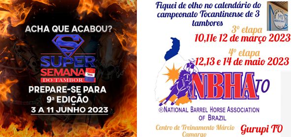 Pensando nisso o Centro de Treinamento Márcio Camargo, juntamente com o parceiro Divino Ribeiro estão realizando o 1º Campeonato Tocantinense de 3 Tambores NBHA que acontece em quatro Etapas, duas já ocorreram e as próximas serão nos meses de MARÇO e MAIO/2023, quando serão classificados atletas (cavalo e cavaleiro) para representar nosso Tocantins na SUPER SEMANA DO TAMBOR que acontecerá no mês de JUNHO deste ano na Pista mais veloz do mundo que fica no Haras Raphaela na Cidade de Tietê/SP, organizada pela NBHA – National Barrel Horse Association of Brazil.