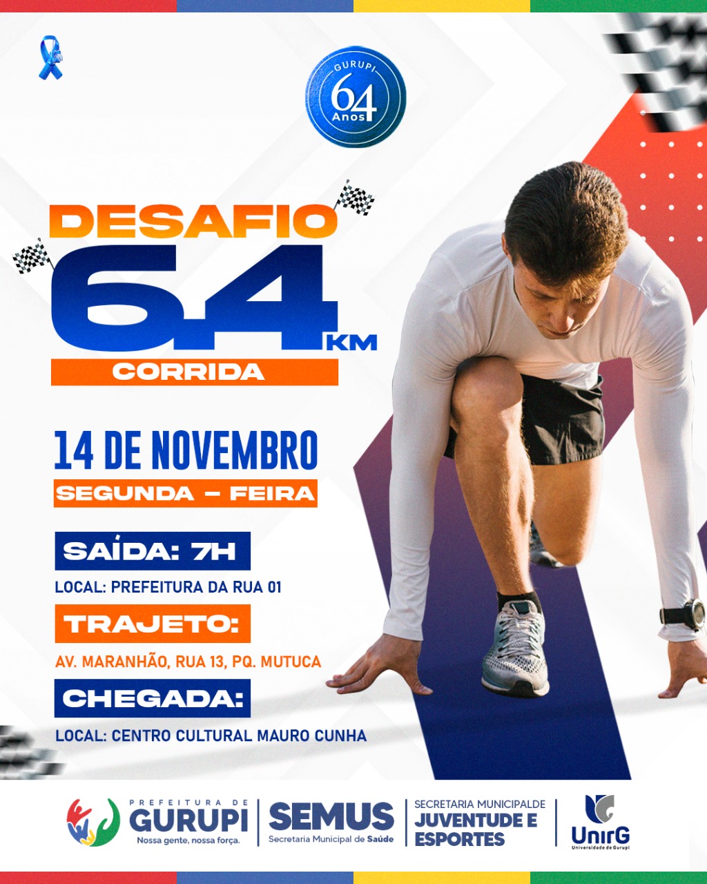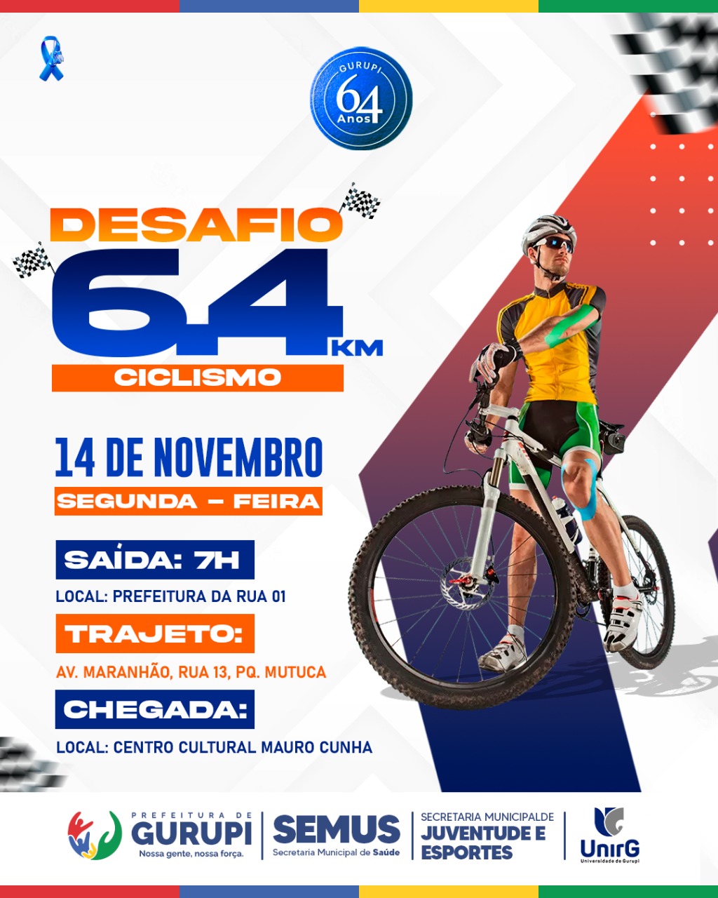 - 07 horas – Passeio Ciclístico e Corrida Desafio 6.4 – Concentração Prefeitura (Rua 1) e chegada no Centro Cultural Mauro Cunha