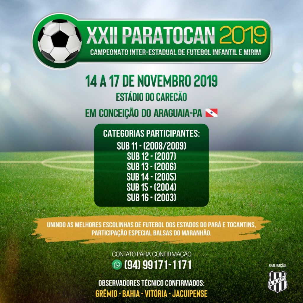 As categorias sub-13, sub-15 e sub-16 estarão disputando entre os dias 15, 16 e 17 de novembro a 22° edição do Torneio Paratocan realizado na cidade de Conceição do Araguaia/PA. O certame é tradicional naquela região e envolve como o próprio nome diz os estados do Tocantins e Pará e recentemente times do Maranhão também participam da competição.