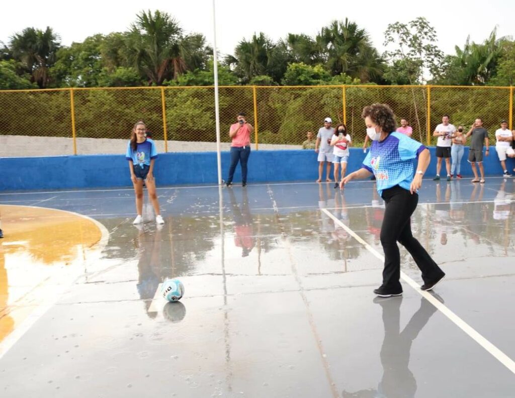 Dando continuidade à programação esportiva, no período vespertino, a prefeita Josi Nunes entregou a reforma da quadra poliesportiva do Uniclube. A programação iniciou com uma partida de futsal feminino, jogada pelas servidoras públicas municipais, que mostraram muito talento e desenvoltura, além de interação e descontração. A partida encerrou em 2 a 2.
