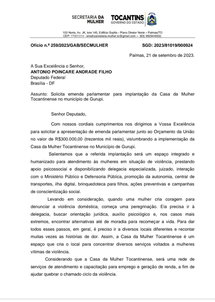 No último dia 16 de outubro a Secretária Estadual da Mulher Berenice Barbosa defendeu na audiência pública da LDO 2024 a implantação da Casa da Mulher Tocantinense nos municípios de Gurupi e Araguaína, que tem como objeto acolher as mulheres vítimas de violência e proporcionar a elas subsídios necessários para que elas possam voltar a trabalhar, a ter dignidade.