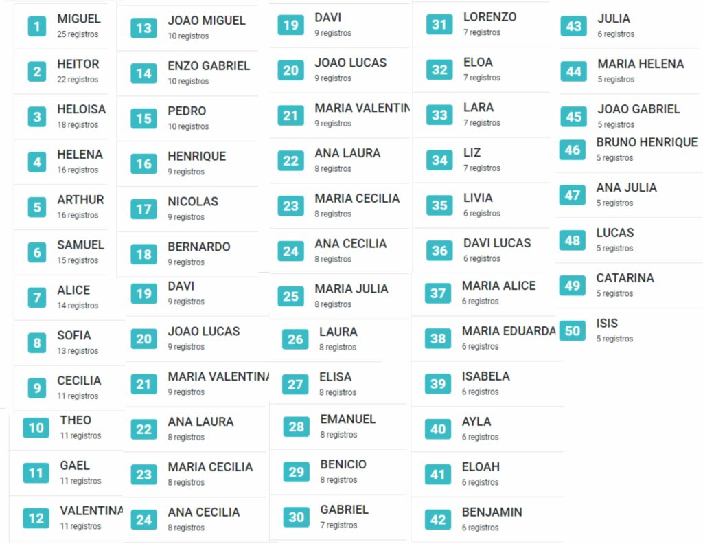 Os 50 nomes mais registrados