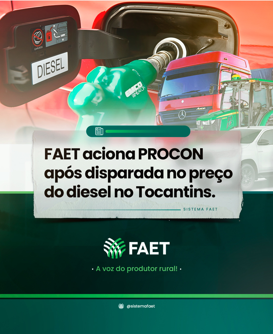 A Federação da Agricultura e Pecuária do Estado do Tocantins (FAET) protocolou ofício junto ao PROCON/TO solicitando monitoramento e fiscalização da evolução dos preços do óleo diesel no estado. A iniciativa ocorre após levantamento técnico identificar variações expressivas no valor do combustível em diferentes municípios tocantinenses.