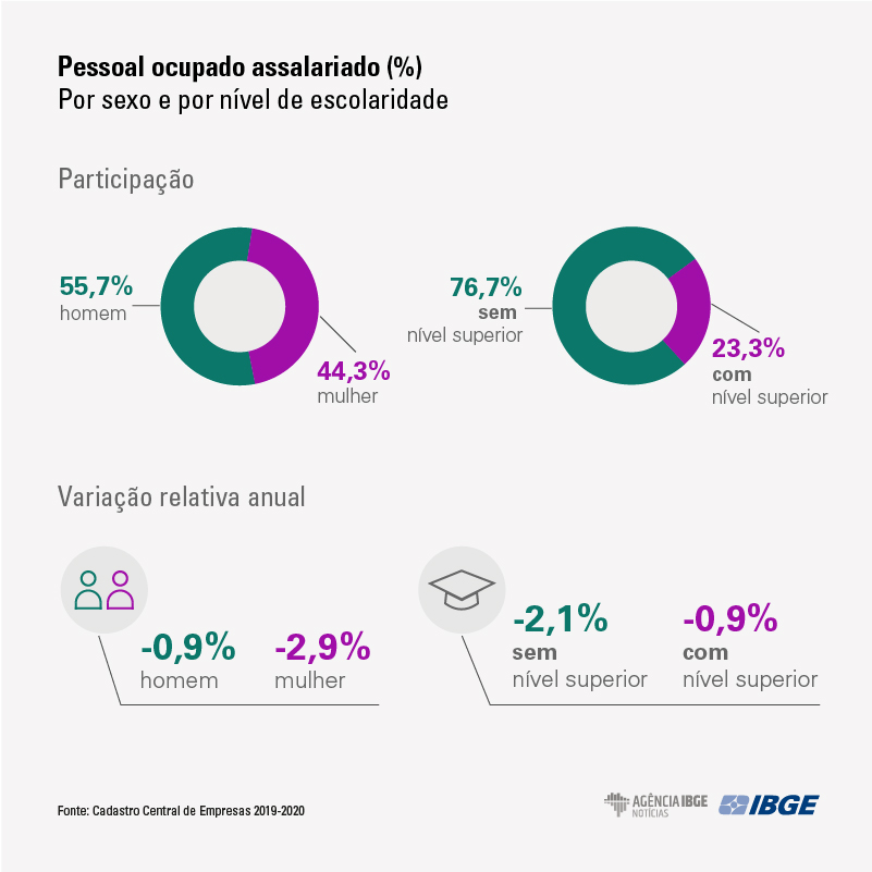 Em 2020, as mulheres perderam mais postos de trabalho que os homens. Enquanto o número de homens ocupados assalariados caiu 0,9%, o de mulheres caiu 2,9%. Do total de 825,3 mil postos de trabalho perdidos entre 2019 e 2020, cerca de 593,6 mil (ou 71,9%) eram ocupados por mulheres. Com isso, pela primeira vez desde 2009, houve queda na participação feminina no pessoal ocupado assalariado, de 44,8% em 2019 para 44,3% em 2020, o menor nível desde 2016.