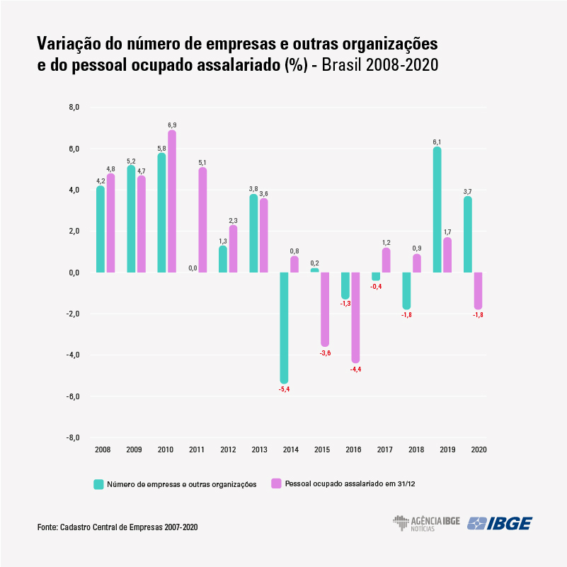 De acordo com o gerente da pesquisa, esse aumento foi puxado por aquelas empresas que não têm funcionários. O número delas cresceu 8,6% em 2020. Todos os demais portes de firma caíram: as microempresas que empregam de uma a nove pessoas assalariadas caíram 0,4%; as pequenas empresas que têm de 10 a 49 empregados, 5,3%; as médias empresas (50 a 250 pessoas), 2,3%; e as grandes empresas (mais de 250 pessoas), 1,0%.